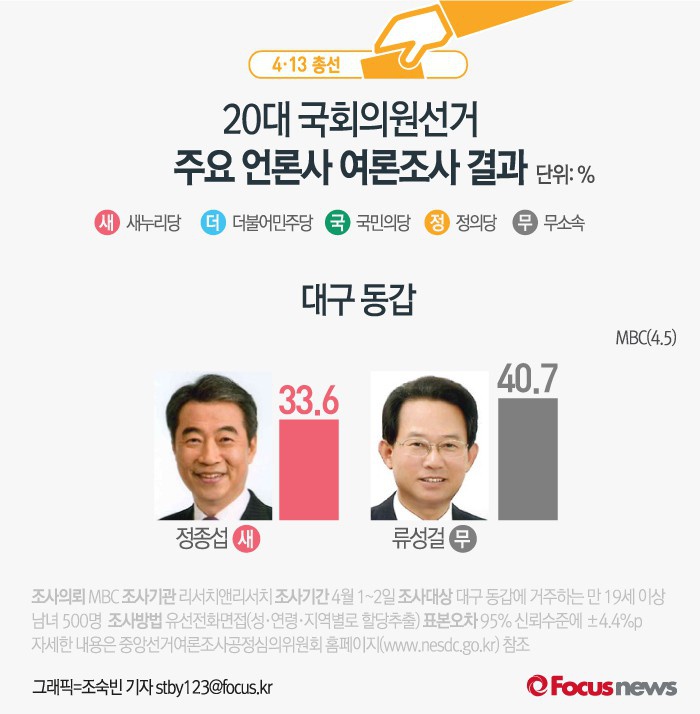(서울=포커스뉴스) MBC가 여론조사기관 리서치앤리서치에 의뢰해 5일 발표한 결과에 따르면 대구 동갑에서 새누리당 정종섭 후보의 지지율은 33.6%, 무소속 류성걸 후보의 지지율은 40.7%인 것으로 나타났다.