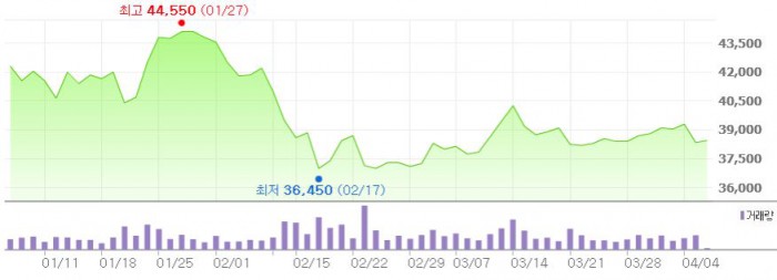 그는 "지난해 2NE1의 매출 비중은 2% 정도로 대부분 음원 저작권 매출"이라며 "탈퇴에 따른 실적 변동성은 전혀 없을 것"이라고 분석했다.최근 3개월간 YG엔터 주가 추이 <그래픽출처=네이버>