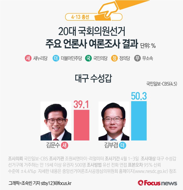 (서울=포커스뉴스) CBS와 국민일보가 공동으로 여론조사 전문기관인 조원씨앤아이와 리얼미터에 의뢰해 5일 발표한 자료에 따르면 대구 수성갑에서 더민주 김부겸 후보의 지지율은 50.3%, 새누리당 김문수 후보의 지지율은 39.1%인 것으로 나타났다.