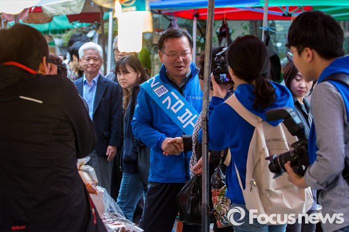 MBC가 여론조사기관 리서치앤리서치에 의뢰해 5일 발표한 결과에 따르면 김부겸 후보가 54.2%의 지지율을 보이며 김문수 후보(31.8%)를 큰 폭으로 앞서고 있는 것으로 나타났다.더불어민주당 대구 수성구갑 김부겸 후보가 3월 31일 오후 대구 수성구 신매시장을 방문해 유권자들에게 한 표를 호소 하고 있다. 2016.03.31 강진형 기자