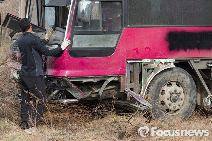 (인천=포커스뉴스) 6일 오전 인천국제공항고속도로에서 통근버스가 전복되는 사고가 발생, 한 관계자가 견인작업을 준비하고 있다.