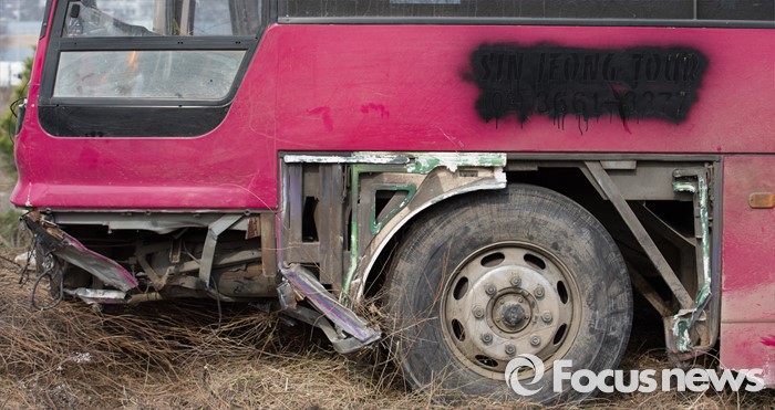 (인천=포커스뉴스) 6일 오전 인천국제공항고속도로에서 통근버스가 전복되는 사고가 발생, 차량이 파손되어 있다.