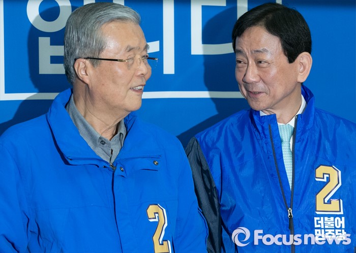 (서울=포커스뉴스) 6일 오전 진영 더불어민주당 서울 용산구 후보 선거사무소에서 열린 중앙선거대책위원회의에 참석한 김종인(왼쪽) 비대위 대표 겸 선대위원장와 진 후보가 대화하고 있다.