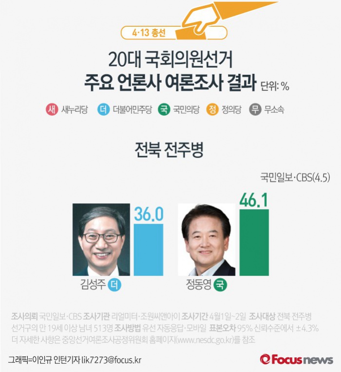 (서울=포커스뉴스) 국민일보와 CBS이 여론조사기관 리얼미터와 조원씨앤아이에 의뢰해 5일 발표한 결과에 따르면 전북 전주병에서 더불어민주당 김성주 후보의 지지율은 36.0%, 국민의당 정동영 후보의 지지율은 46.1%인 것으로 나타났다.