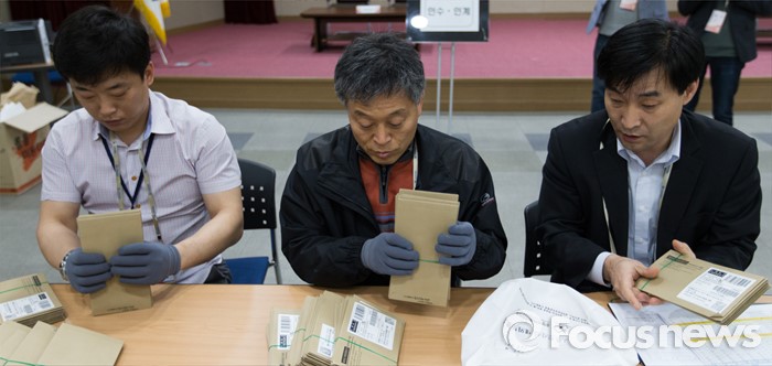 (인천=포커스뉴스) 제20대 국회의원선거 재외투표 우편물 접수 시작일인 6일 오전 인천 중구 국제우편물류센터에서 직원들이 재외투표 회송 우편물을 분류하고 있다.