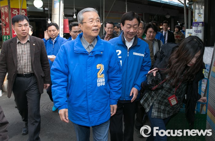 (서울=포커스뉴스) 김종인(왼쪽) 더불어민주당 비대위 대표 겸 선대위원장과 진영 서울 용산구 후보가 6일 오전 용문시장을 방문해 대화를 하며 이동하고 있다.