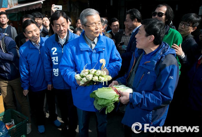 (서울=포커스뉴스) 김종인(오른쪽) 더불어민주당 비대위 대표 겸 선대위원장과 진영(가운데) 서울 용산구 후보가 6일 오전 용문시장을 방문해 상인의 채소를 보며 대화하고 있다.
