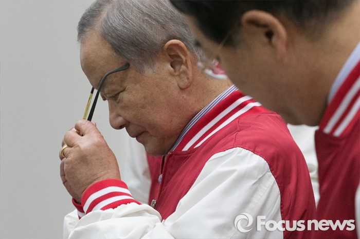(서울=포커스뉴스) 강봉균 새누리당 공동선대위원장이 6일 오전 서울 여의도 국회에서 경제정책 공약 5호를 발표하기 전, 안경을 고쳐쓰고 있다.