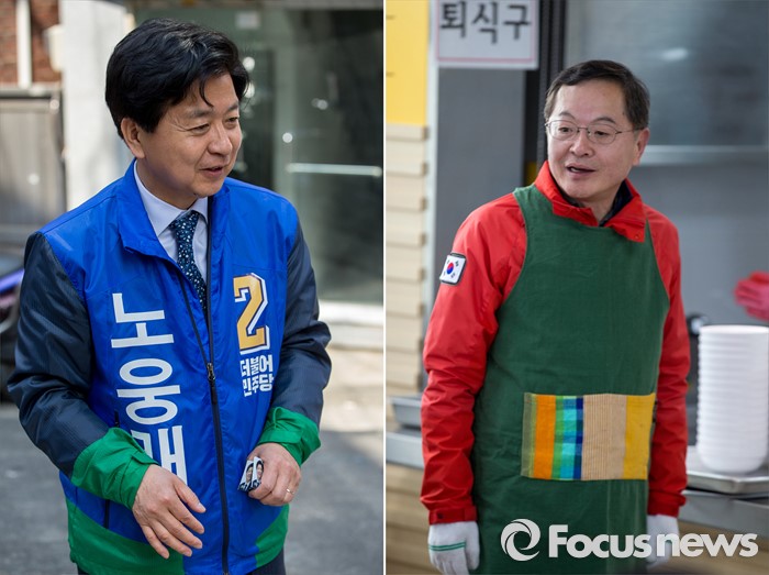 (서울=포커스뉴스) 안대희(오른쪽) 새누리당 마포구갑 후보와 노웅래 더불어민주당 마포구갑 후보가 6일 오전 서울 마포구 일대에서 선거운동을 하고 있다.
