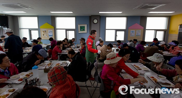 (서울=포커스뉴스) 안대희 새누리당 마포구갑 후보가 6일 오전 서울 마포구 용강노인복지회관에서 배식봉사를 하고 있다.
