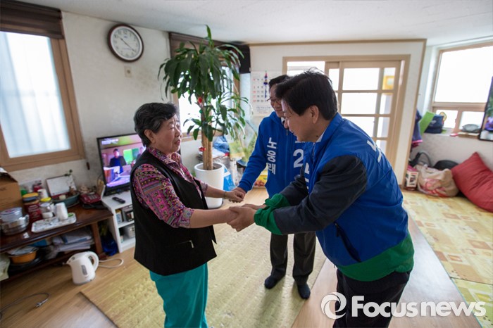 (서울=포커스뉴스) 노웅래 더불어민주당 마포구갑 후보가 6일 오전 서울 마포구 공덕동 경로당을 방문해 어르신의 손을 잡으며 한 표를 호소 하고 있다.