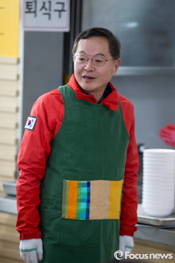 (서울=포커스뉴스) 안대희 새누리당 마포구갑 후보가 6일 오전 서울 마포구 용강노인복지회관에서 배식봉사를 하고 있다.