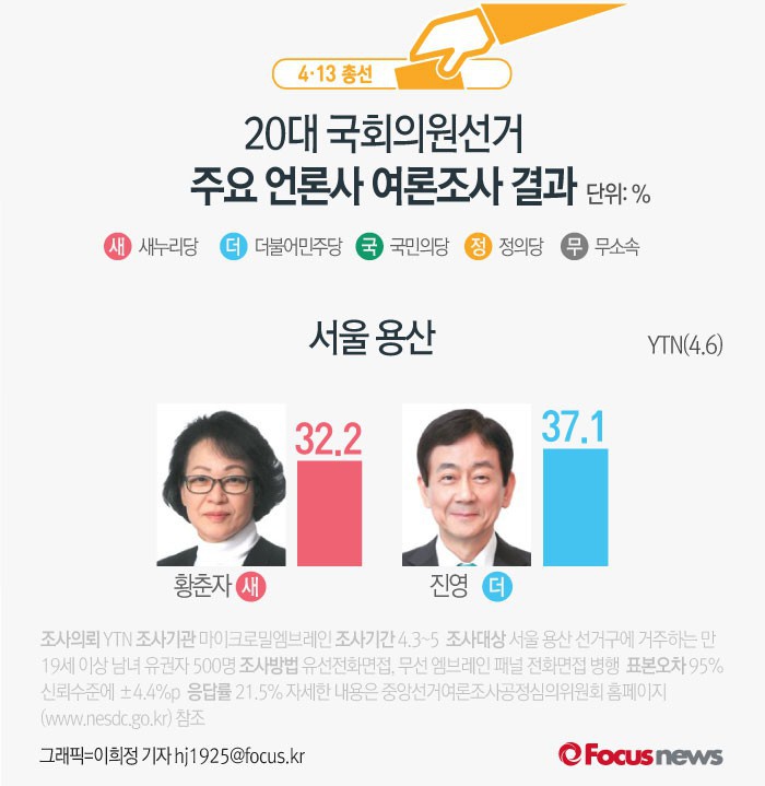 (서울=포커스뉴스) YTN이 마이크로밀엠브레인에 의뢰해 6일 발표한 서울 용산 여론조사 결과에 따르면 새누리당 황춘자 후보의 지지율은 32.2%, 더불어민주당 진영 후보는 37.1%를 기록했다.