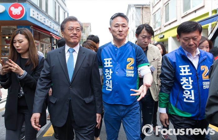 (용인=포커스뉴스) 6일 오전 경기 용인 기흥구 보정동 카페거리에서 문재인 더불어민주당 전 대표가 표창원 더민주 용인시정 후보 지원유세를 하고 있다.