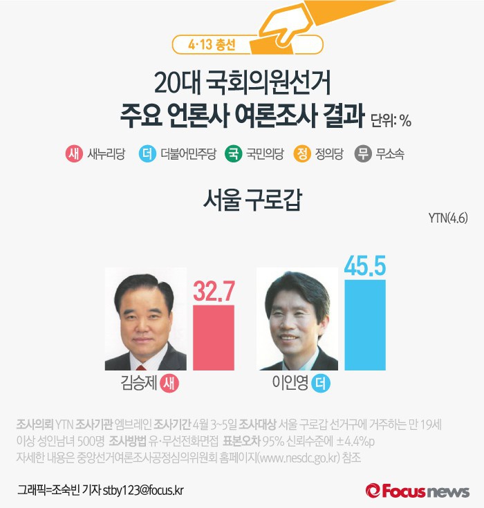 (서울=포커스뉴스) YTN이 여론조사기관 엠브레인에 의뢰해 6일 발표한 결과에 따르면 서울 구로갑에서 새누리당 김승제 후보의 지지율은 32.7%, 더민주 이인영 후보의 지지율은 45.5%인 것으로 나타났다.