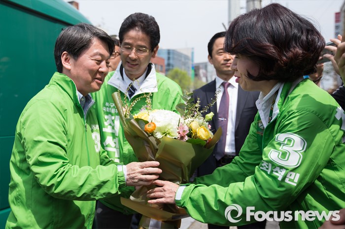 (대구=포커스뉴스) 안철수 국민의당 상임공동대표가 6일 오후 대구광역시 북구 경북대학교 앞에서 최석민 대구 북구갑 후보 아내에게 꽃다발을 받고 있다.