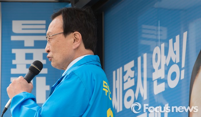 (세종=포커스뉴스) 이해찬 무소속 후보가 6일 오후 세종시 도담동 중앙타운 네거리에서 지지를 호소하고 있다.