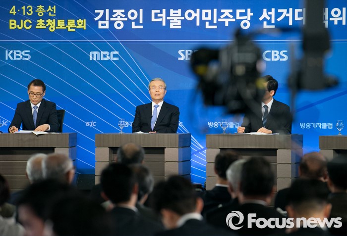 (서울=포커스뉴스) 김종인(가운데) 더불어민주당 비대위 대표 겸 선대위원장이 6일 오후 서울 종로구 세종문화회관에서 열린 한국방송기자클럽 초청 토론회에 참석해 모두발언을 하고 있다.