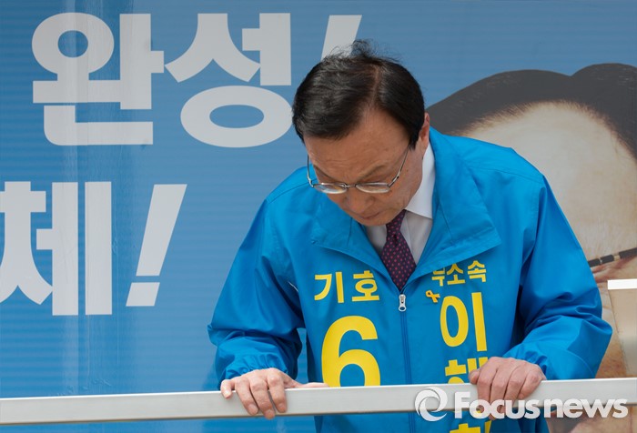 (세종=포커스뉴스) 이해찬 무소속 후보가 6일 오후 세종시 도담동 중앙타운 네거리에서 지지를 호소하고 있다.