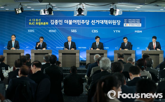 (서울=포커스뉴스) 김종인(왼쪽 세번째) 더불어민주당 비대위 대표 겸 선대위원장이 6일 오후 서울 종로구 세종문화회관에서 열린 한국방송기자클럽 초청 토론회에 참석해 모두발언을 하고 있다.