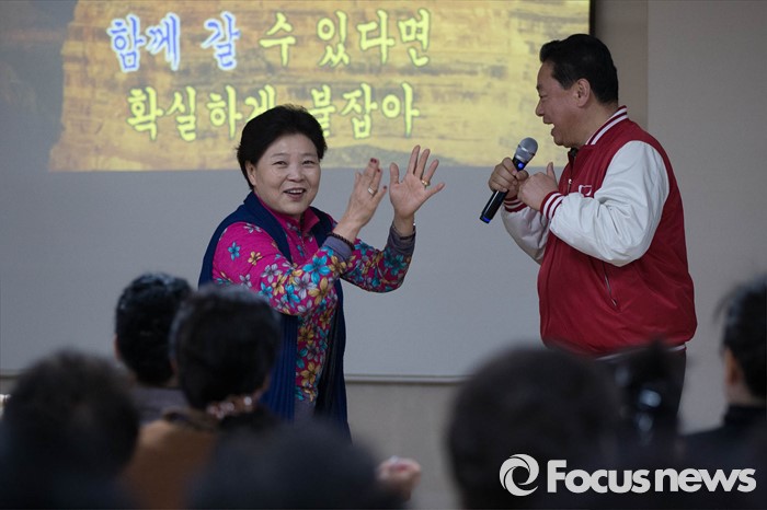 | △ 노래교실서 즐거운 시간 갖는 구상찬 후보 |