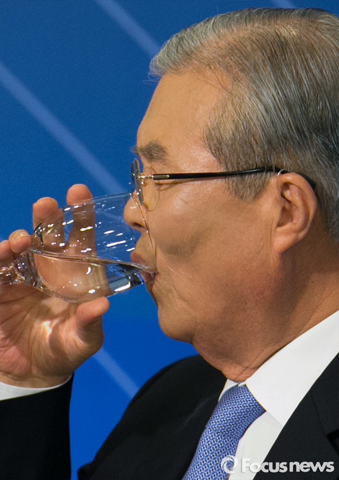 (서울=포커스뉴스) 김종인 더불어민주당 비대위 대표 겸 선대위원장이 6일 오후 서울 종로구 세종문화회관에서 한국방송기자클럽 초청 토론회를 마친 뒤 물을 마시고 있다.