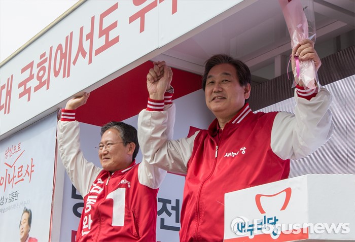 (당진=포커스뉴스) 6일 오후 충남 당진 구 버스터미널 사거리에서 김무성(오른쪽) 새누리당 대표가 김동완 당진시 후보 지원유세를 하고 있다.