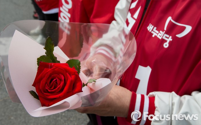 (당진=포커스뉴스) 6일 오후 충남 당진 구 버스터미널 사거리에서 열린 김무성 새누리당 대표, 김동완 당진시 후보 지원유세장에서 당 관계자가 김 대표에게 건넬장이꽃을 들고 있다.