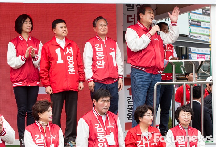 (당진=포커스뉴스) 6일 오후 충남 당진 구 버스터미널 사거리에서 김무성(오른쪽) 새누리당 대표가 김동완 당진시 후보 지원유세를 하고 있다.