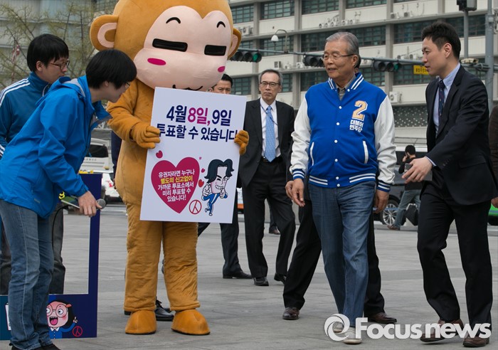 (서울=포커스뉴스) 김종인 더불어민주당 비대위 대표 겸 선대위원장이 6일 오후 서울 광화문광장에서 진행되는 20대 총선 사전투표 캠페인에 참석하고 있다.