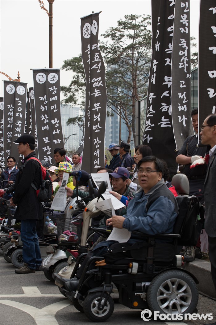 (서울=포커스뉴스) 6일 오후 서울 영등포구 국회의사당역 인근에서 범장애계총선연대 회원들을 비롯한 참석자들이 '장애인 정치 참여보장을 위한 범장애계 총궐기대회'를 하고 있다.