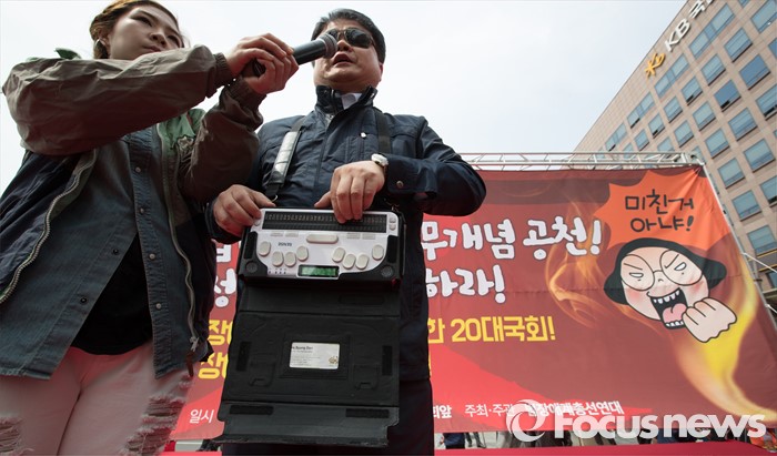 (서울=포커스뉴스) 6일 오후 서울 영등포구 국회의사당역 인근에서 열린 '장애인 정치 참여보장을 위한 범장애계 총궐기대회'에서 한 참석자가 점자정보단말기를 이용해 발언을 하고 있다.