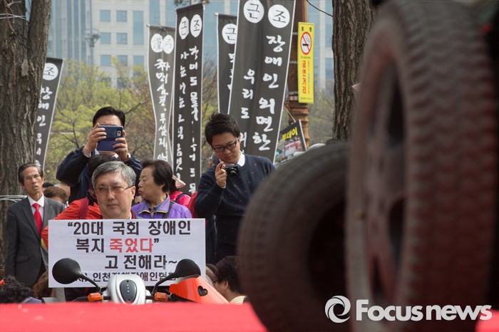 (서울=포커스뉴스) 6일 오후 서울 영등포구 국회의사당역 인근에서 범장애계총선연대 회원들을 비롯한 참석자들이 '장애인 정치 참여보장을 위한 범장애계 총궐기대회'를 하고 있다.