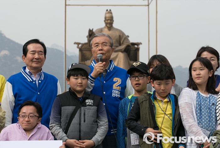 (서울=포커스뉴스) 김종인 더불어민주당 비대위 대표 겸 선대위원장이 6일 오후 서울 광화문광장에서 정세균 종로구 후보, 비례대표 후보, 창원 봉강초등학교 학생들과 20대 총선 사전투표 캠페인을 하고 있다.