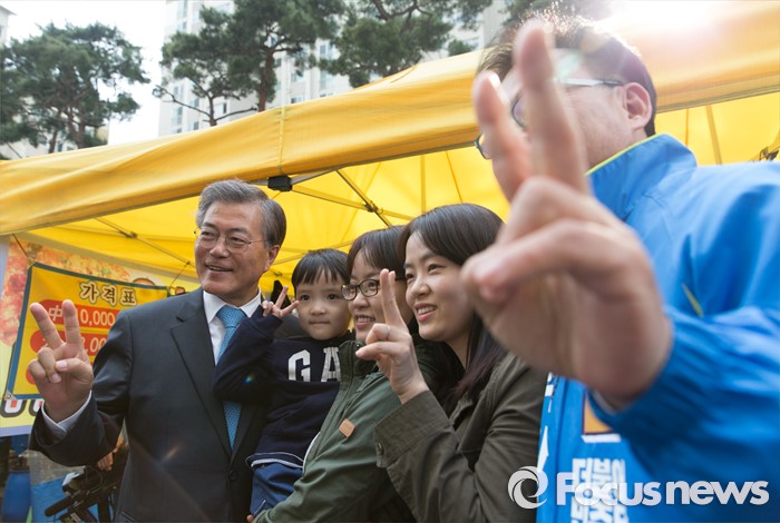 (수원=포커스뉴스) 6일 오후 경기 수원시 영통구 매탄1동 주민센터 앞에서 문재인 더불어민주당 전 대표가 박광온 더민주 수원시정 후보 지원유세를 하고 있다.