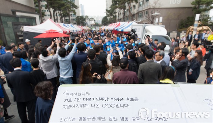 (수원=포커스뉴스) 6일 오후 경기 수원시 영통구 매탄1동 주민센터 앞에서 문재인 더불어민주당 전 대표가 박광온 더민주 수원시정 후보 지원유세를 하고 있다.
