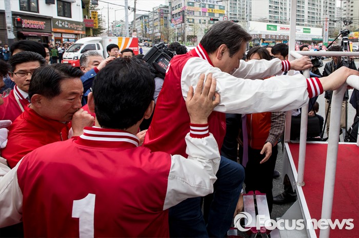(천안=포커스뉴스) 6일 오후 충남 천안 두정로에서 최민기 새누리당 천안시을 후보 지원유세에 나선 김무성 대표가 관계자들이ㅡ 도움을 받아 유세차에 오르고 있다.