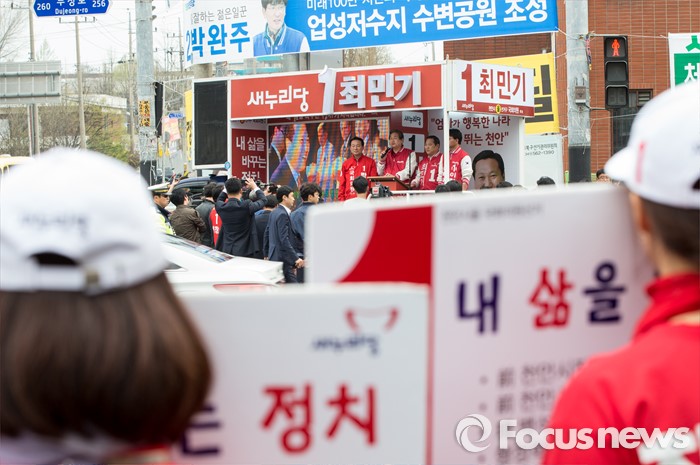 (천안=포커스뉴스) 6일 오후 충남 천안 두정로에서 최민기 새누리당 천안시을 후보 지원유세에 나선 김무성 대표가 유권자들에게 지지를 호소하고 있다.