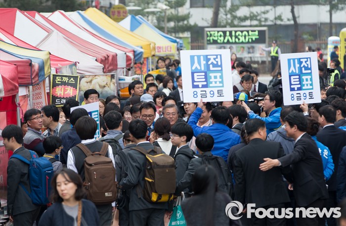 (수원=포커스뉴스) 6일 오후 경기 수원시 영통구 매탄1동 주민센터 앞에서 문재인 더불어민주당 전 대표가 박광온 더민주 수원시정 후보 지원유세를 하고 있다.
