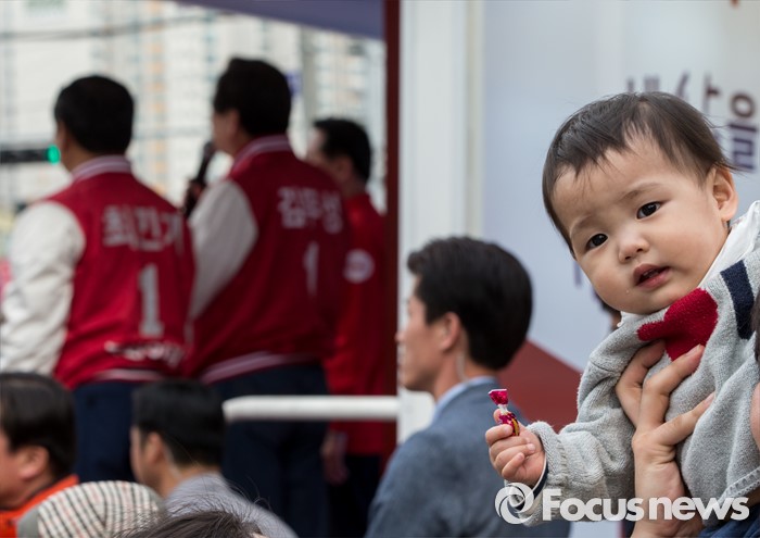 (천안=포커스뉴스) 6일 오후 충남 천안 두정로에서 열린 최민기 새누리당 천안시을 후보 지원유세에서 한 어린이가 호기심 어린 표정을 짓고 있다.