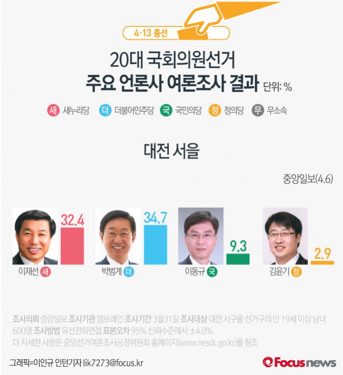 (서울=포커스뉴스) 중앙일보가 여론조사기관 엠브레인에 의뢰해 6일 발표한 결과에 따르면 대전 서을의 지지율은 새누리당 이재선 후보(32.4%), 더불어민주당 박범계 후보(34.7%), 국민의당 이동규 후보(9.3%), 정의당 김윤기 후보(2.9%) 순인 것으로 나타났다.