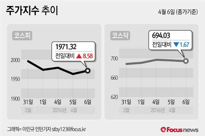(서울=포커스뉴스) 6일 코스피지수는 전날 보다 0.44%(8.58포인트) 오른 1971.32에 장을 마쳤다. 코스닥지수는 전일 대비 0.24%(1.67포인트) 내린 694.03에 마감했다.