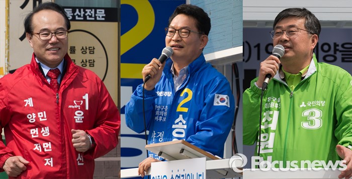 (인천=포커스뉴스) 제20대 총선에 출마한 새누리당 윤형선-더민주 송영길-국민의당 최원식 계양을 후보들이 6일 오후 인천 계양구 일대에서 선거운동을 하고 있다.