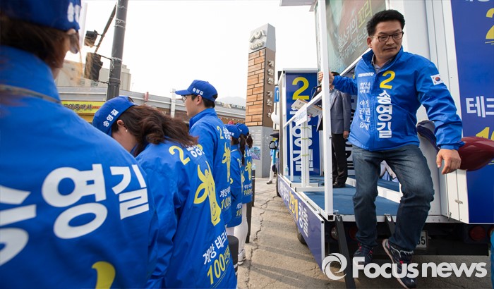 (인천=포커스뉴스) 제20대 총선에 출마한 송영길 더불어민주당 계양을 후보가 6일 오후 인천 계양구 계산역 앞에서 유세를 마친 뒤 선거운동 차에서 내려오고 있다.