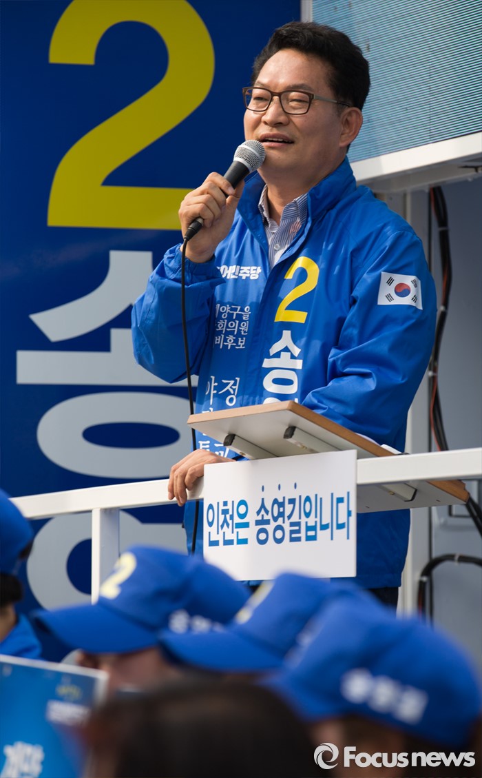 (인천=포커스뉴스) 제20대 총선에 출마한 송영길 더불어민주당 계양을 후보가 6일 오후 인천 계양구 계산역 앞에서 선거운동을 하고 있다.