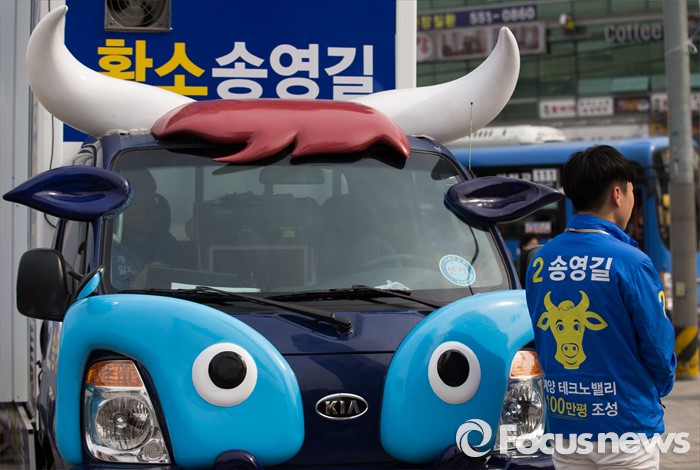 (인천=포커스뉴스) 6일 오후 인천 계양구 계산역 앞에서 제20대 총선에 출마한 송영길 더불어민주당 계양을 후보의 선거운동차량이 황소로 꾸며져 있다.