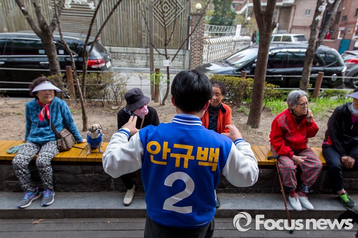 (서울=포커스뉴스) 안규백 더불어민주당 동대문구갑 후보가 6일 오후 서울 동대문구 휘경동 일대에서 유권자들에게 소중한 한 표를 호소 하고 있다.
