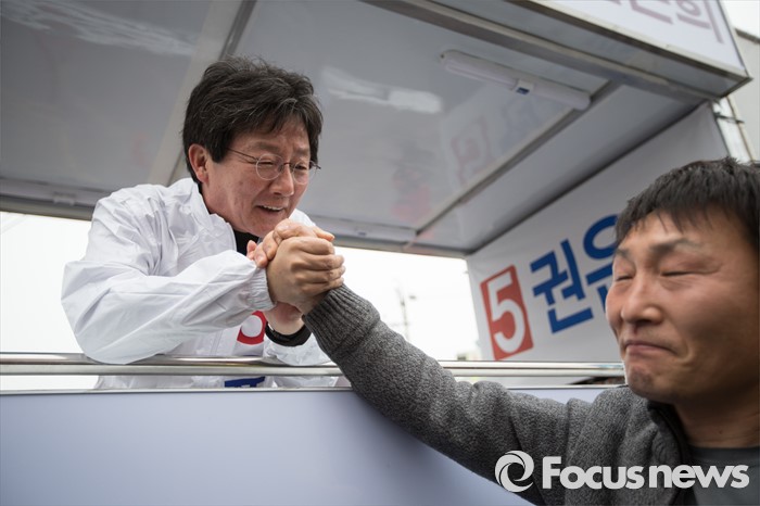 (대구=포커스뉴스) 유승민 무소속 동구을 후보가 6일 오후 대구광역시 북구 칠성시장 앞에서 한 지지자의 손을 잡아주고 있다.