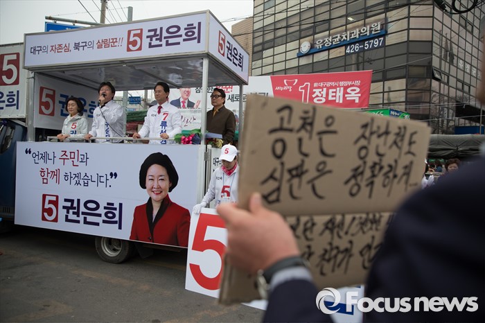 (대구=포커스뉴스) 유승민 무소속 동구을 후보가 6일 오후 대구광역시 북구 칠성시장 앞에서 권은희, 류성걸 무소속 후보와 함께 선거 유세를 하고 있는 가운데 한 유권자가 새누리당 공천을 비판하는 피켓을 들고 있다.