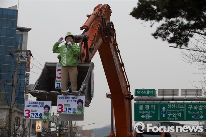 (서울=포커스뉴스) 6일 오후 서울 은평구 연신내 물빛공원에서 고연호 국민의당 은평구을 후보가 포클레인 위에서 유세를 하고 있다.